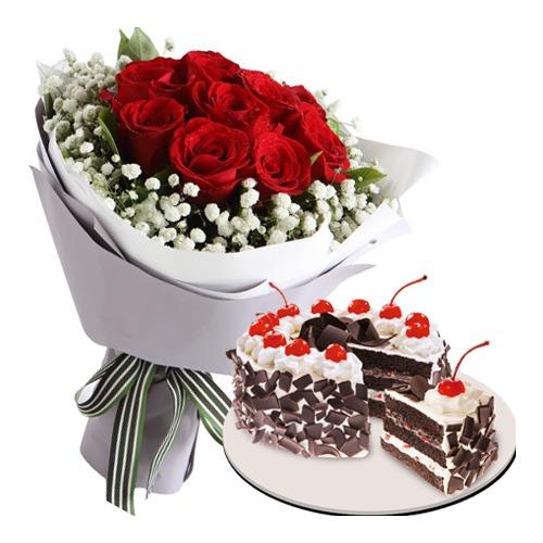 Bouquet of 10 Red Roses and 1/2 Kg Black Forest Cake